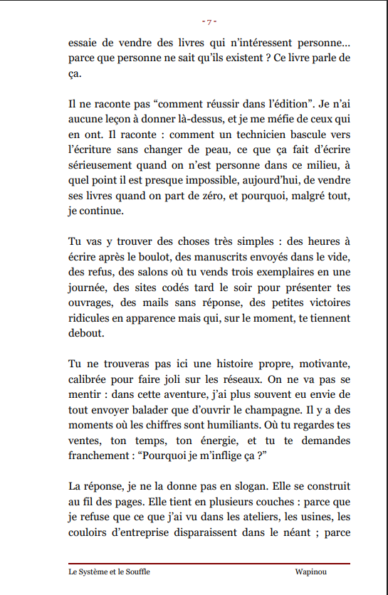 ![]() | Le Système et le Souffle C’est l’histoire d’un gars de la technique, électrotech, ensuite automaticien, qu’on a longtemps traité comme un numéro dans un système. Pendant des années, il fait tourner des machines, dépanne des installations, voit des collègues s’user et disparaître proprement des plannings. Un jour, ce qu’il voit ne lui suffit plus : il commence à écrire. Pas comme un “écrivain-né”, mais comme un technicien qui démonte et remonte la réalité avec des mots. Il bascule alors dans un autre monde, celui de l’auteur inconnu. Il découvre que finir un livre ne veut rien dire : personne ne l’attend, les manuscrits se perdent dans les boîtes mail, les refus sont standard, les silences brutaux. Il se tourne vers l’autoédition, fabrique ses livres, code son site, démarche des libraires, fait des salons… pour au final vendre peu et se prendre en pleine face la violence du marché du livre pour ceux qui n’ont pas de nom. Plutôt que tout lâcher, il change de défi : arrêter de courir après une reconnaissance qui ne viendra peut-être jamais et construire son propre “petit circuit” entre lui et quelques lecteurs réels. Utiliser ce qu’il est, technicien, observateur du terrain, témoin de l’usure humaine, comme colonne vertébrale de ses textes. L’Épilogue ne raconte pas une success story : il assume que rien n’a “explosé”, mais qu’il a gagné autre chose, le droit de raconter son histoire, de donner une voix aux numéros, et de continuer à écrire même si le système, lui, s’en fout. Prix : 5,28 € TTC En stock : 8 | Caractéristiques techniques