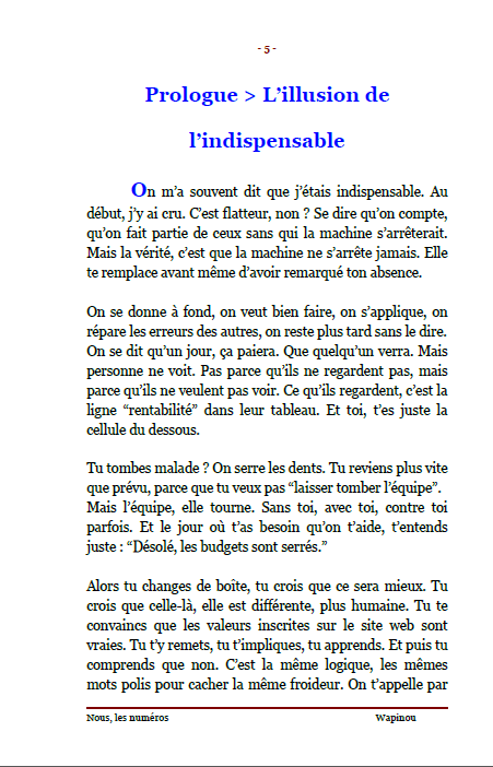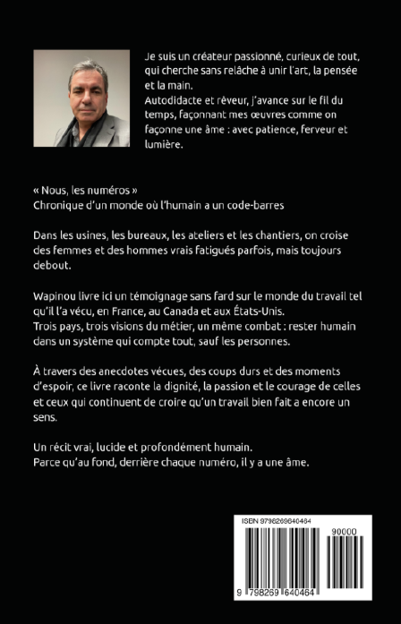 ![]() | Nous, les numéros « Nous, les numéros » Chronique d’un monde où l’humain a un code-barres Dans les usines, les chantiers, les bureaux, derrière chaque badge et chaque matricule, il y a des visages. Des femmes et des hommes vrais, debout, fatigués mais dignes. Wapinou raconte sans détour ce qu’il a vu et vécu : la France qui s’engueule, le Canada qui t’écoute, l’Amérique qui te juge sur ce que tu sais faire. Trois pays, trois visions du travail, une même question : que vaut encore l’humain dans un monde de chiffres ? Ce livre n’est pas un règlement de comptes. C’est un miroir. Un témoignage honnête, fort et lucide sur la réalité du travail moderne ses absurdités, ses espoirs, et sa beauté quand elle existe encore. Un récit vrai, humain, poignant. Parce qu’au fond, derrière chaque numéro, il y a une âme. Édition officielle vendue directement par l’auteur. Prix : 6,50 € TTC En stock : 109 📚 Déjà 21 lecteurs ont rejoint ce voyage intime. | Caractéristiques techniques