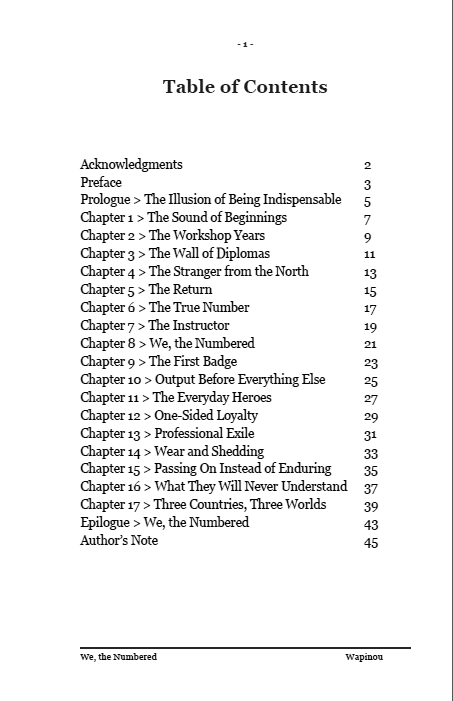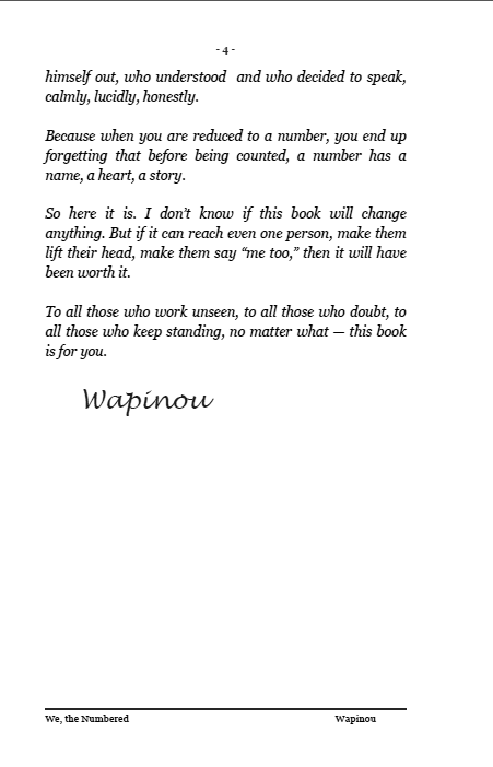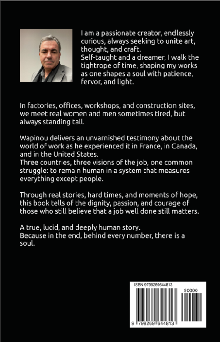 ![]() | We, the Numbered "We, the Numbers" – Chronicle of a World Where Humans Have Barcodes. In factories, on construction sites, in offices, behind every badge and every employee number, there are faces. Real women and men, standing tall, tired but dignified. Wapinou speaks plainly about what he has seen and lived: France, where people argue; Canada, where people listen; The United States, where you are judged by what you can do. Three countries, three visions of work, one same question: what is a human still worth in a world of numbers? This book is not a settling of scores. It is a mirror, an honest, powerful, and lucid testimony about the reality of modern work: its absurdities, its hopes, and its beauty, when it still exists. A true, human, and moving story. Because deep down, behind every number, there is a soul. Official edition sold directly by the author. Prix : 5,50 € TTC En stock : 4 | Caractéristiques techniques
