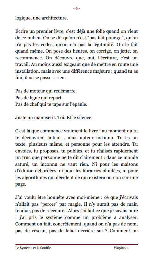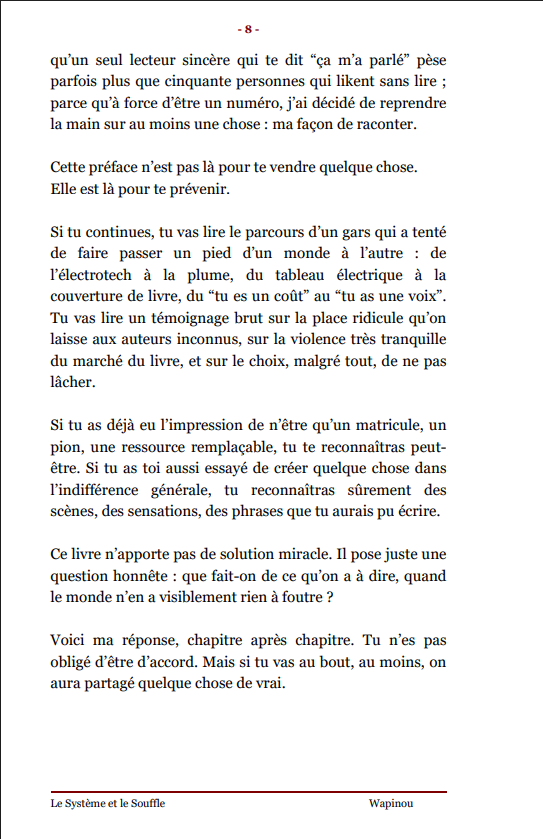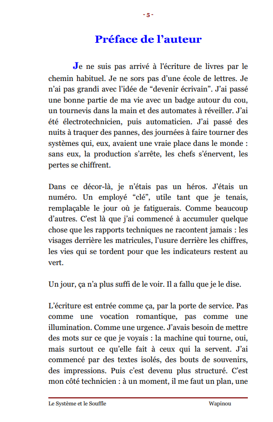 ![]() | Le Système et le Souffle C’est l’histoire d’un gars de la technique, électrotech, ensuite automaticien, qu’on a longtemps traité comme un numéro dans un système. Pendant des années, il fait tourner des machines, dépanne des installations, voit des collègues s’user et disparaître proprement des plannings. Un jour, ce qu’il voit ne lui suffit plus : il commence à écrire. Pas comme un “écrivain-né”, mais comme un technicien qui démonte et remonte la réalité avec des mots. Il bascule alors dans un autre monde, celui de l’auteur inconnu. Il découvre que finir un livre ne veut rien dire : personne ne l’attend, les manuscrits se perdent dans les boîtes mail, les refus sont standard, les silences brutaux. Il se tourne vers l’autoédition, fabrique ses livres, code son site, démarche des libraires, fait des salons… pour au final vendre peu et se prendre en pleine face la violence du marché du livre pour ceux qui n’ont pas de nom. Plutôt que tout lâcher, il change de défi : arrêter de courir après une reconnaissance qui ne viendra peut-être jamais et construire son propre “petit circuit” entre lui et quelques lecteurs réels. Utiliser ce qu’il est, technicien, observateur du terrain, témoin de l’usure humaine, comme colonne vertébrale de ses textes. L’Épilogue ne raconte pas une success story : il assume que rien n’a “explosé”, mais qu’il a gagné autre chose, le droit de raconter son histoire, de donner une voix aux numéros, et de continuer à écrire même si le système, lui, s’en fout. Prix : 5,28 € TTC En stock : 8 | Caractéristiques techniques