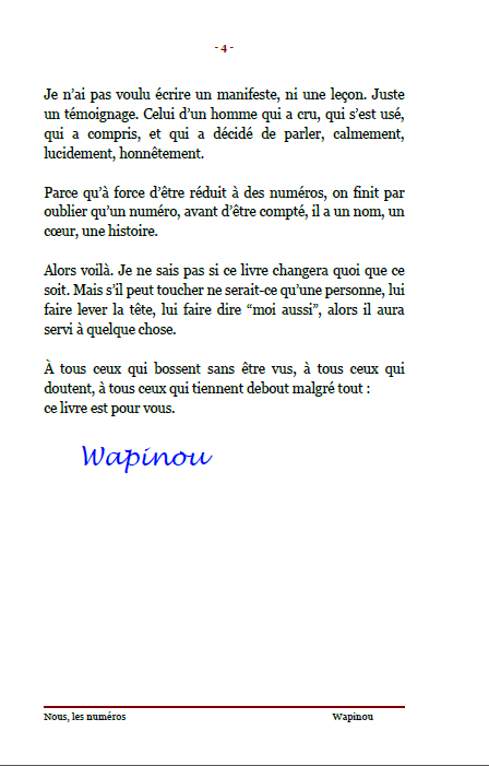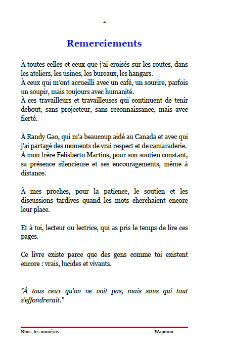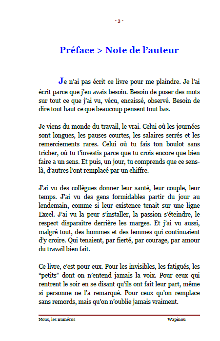 ![]() | Nous, les numéros « Nous, les numéros » Chronique d’un monde où l’humain a un code-barres Dans les usines, les chantiers, les bureaux, derrière chaque badge et chaque matricule, il y a des visages. Des femmes et des hommes vrais, debout, fatigués mais dignes. Wapinou raconte sans détour ce qu’il a vu et vécu : la France qui s’engueule, le Canada qui t’écoute, l’Amérique qui te juge sur ce que tu sais faire. Trois pays, trois visions du travail, une même question : que vaut encore l’humain dans un monde de chiffres ? Ce livre n’est pas un règlement de comptes. C’est un miroir. Un témoignage honnête, fort et lucide sur la réalité du travail moderne ses absurdités, ses espoirs, et sa beauté quand elle existe encore. Un récit vrai, humain, poignant. Parce qu’au fond, derrière chaque numéro, il y a une âme. Édition officielle vendue directement par l’auteur. Prix : 6,50 € TTC En stock : 109 📚 Déjà 21 lecteurs ont rejoint ce voyage intime. | Caractéristiques techniques