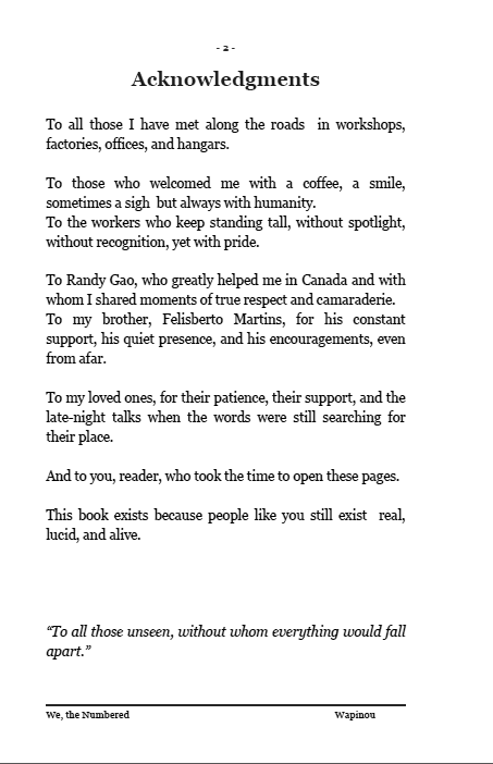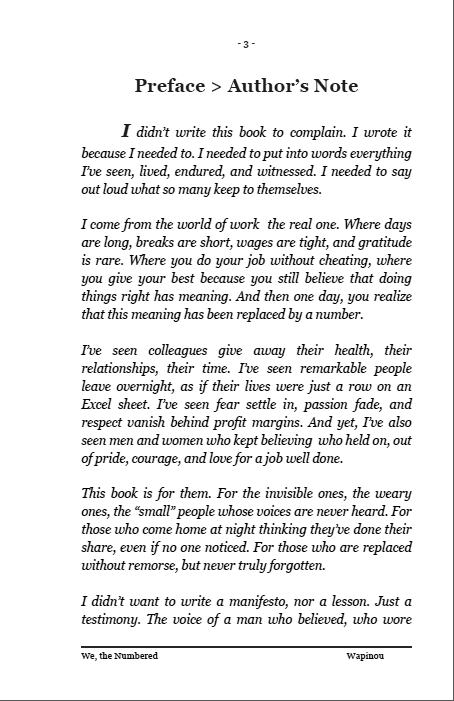 ![]() | We, the Numbered "We, the Numbers" – Chronicle of a World Where Humans Have Barcodes. In factories, on construction sites, in offices, behind every badge and every employee number, there are faces. Real women and men, standing tall, tired but dignified. Wapinou speaks plainly about what he has seen and lived: France, where people argue; Canada, where people listen; The United States, where you are judged by what you can do. Three countries, three visions of work, one same question: what is a human still worth in a world of numbers? This book is not a settling of scores. It is a mirror, an honest, powerful, and lucid testimony about the reality of modern work: its absurdities, its hopes, and its beauty, when it still exists. A true, human, and moving story. Because deep down, behind every number, there is a soul. Official edition sold directly by the author. Prix : 5,50 € TTC En stock : 4 | Caractéristiques techniques